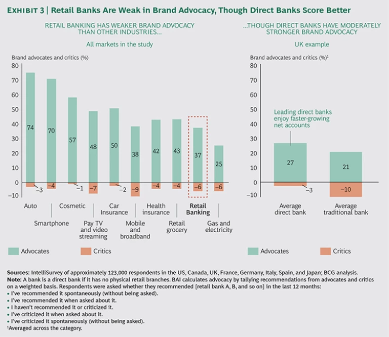 BCG’s Brand Advocacy Index (BAI) measures word-of-mouth influence, including both recommendations and criticism, for 650 brands in more than 35 industries based on 120,000 surveys completed in eight countries worldwide. Responses are weighted to give an overall brand advocacy score by brand per country. The 2015 BAI study showed that retail banks rank significantly behind businesses in most other industries in brand advocacy, though direct banks fare slightly better. (See Exhibit 3.)