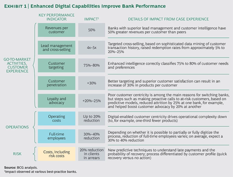 In our experience, enhanced digital capabilities drive substantial and measurable improvements in banks’ financial and operational performance. These benefits can include boosting revenues per customer by 50%, increasing customer penetration by 30%, and reducing operating costs by as much as 20%. (See Exhibit 1.)