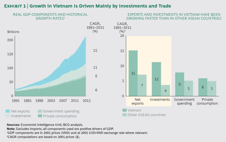 Foreign Investment and Export Growth. Overall economic growth in Vietnam has been fueled by rapidly rising foreign investment and exports, both of which are growing significantly faster there than in other ASEAN nations. (See Exhibit 1.) Top export segments resulting from foreign direct investment (FDI) include telecommunications devices and parts, textiles, computers and electronic equipment, and footwear. Together these four categories made up almost 45% of all exports in 2014. Total exports in 2014 were approximately $150 billion, of which $94 billion, or almost two-thirds, resulted from the FDI sector.