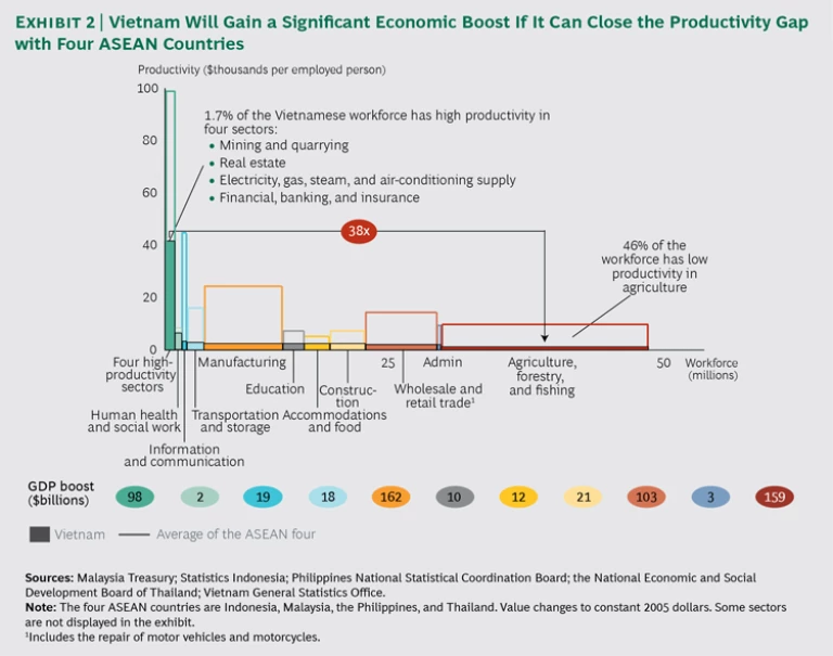 Room for Improvement in Productivity. There is ample room in Vietnam for productivity growth, which could have an enormous overall impact. Simply raising productivity to the level of the top ASEAN performers (Indonesia, Malaysia, the Philippines, and Thailand) in three major sectors of the economy—manufacturing, wholesale and retail, and agriculture, which together employ some 39 million people—would add almost $424 billion to Vietnam’s 2015 GDP. (See Exhibit 2.)
