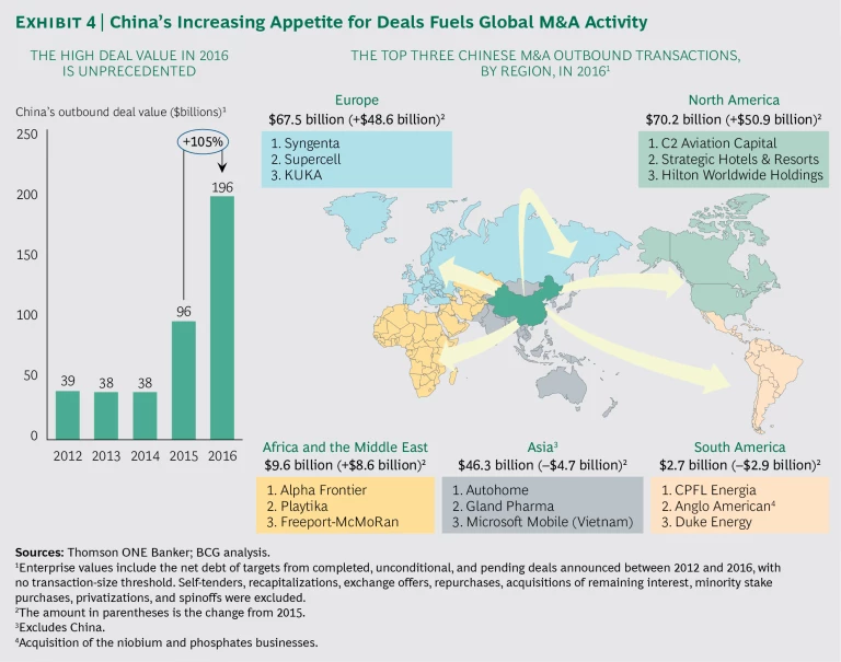 China goes shopping. China embarked on a global shopping spree in 2016, more than doubling, to almost $200 billion, its 2015 announced deal value. About two-thirds of China’s M&A activity today is outbound, with Europe and North America emerging as the most attractive target regions. (See Exhibit 4.)