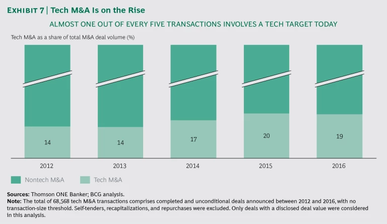 Though the overall M&A market has grown significantly over the past five years, the share of deals involving a tech target has been rising even faster. Today, one out of every five transactions has a clear link to some form of technology, and the value of these deals as a percentage of the overall market is even greater. (See Exhibit 7.)