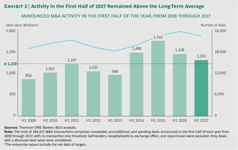 Despite political uncertainty in the US and Europe, global M&A activity has maintained its momentum, with almost $1.3 trillion in announced deal value in the first half of 2017, well above the historical average of $1.2 trillion. (See Exhibit 3.) Deal volume has also been running above average, with more than 22,000 deals announced in the first half of the past three years.
