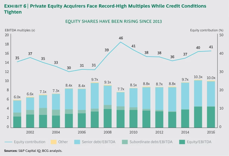 That said, we see an increasingly challenging environment for private equity buyers as they face both record-high target multiples and more competition from cash-rich corporate acquirers. The number of high-quality assets is shrinking, and wary lenders are demanding that firms put up larger equity shares to get transactions done. (See Exhibit 6.) Despite low interest rates, this market environment challenges private equity buyers to execute operationally in order to achieve their target returns.