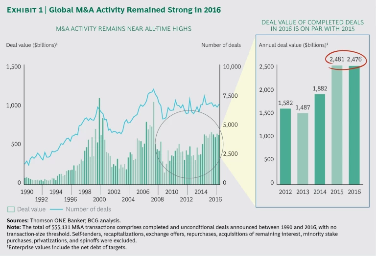 In last year’s M&A report, we observed that the direction of the market was not clear, and we questioned how long the heights could be maintained. (See The 2016 M&A Report, BCG report, August 2016.) One year later, the path remains unclear, with many of the same fundamental factors in place.
