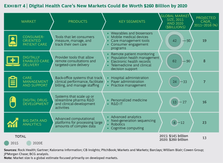 An increasing amount of money is going into digital health care: venture funding reached a record $7 billion in 2016, three times the amount invested in 2013. In all, digital health care businesses were worth $145 billion in 2015—and by 2020, will be worth a projected $260 billion. (See Exhibit 4.)