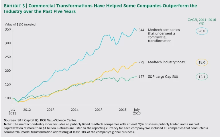 As Exhibit 3 illustrates, they are becoming more profitable and delivering superior shareholder value. (For a case study, see the sidebar, “A Medtech Company Revamps Its Commercial Model and Generates $1.5 Billion in Shareholder Value.”) By contrast, those that have not yet taken action face an increasingly urgent mandate for change.