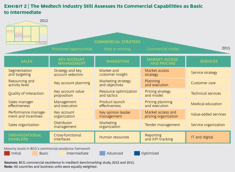 Since our survey in 2012, the picture has not changed materially. Most of the more than 6,000 employees who participated in the 2015 survey gave their companies similar basic to intermediate ratings. One noteworthy change is that priorities have shifted from sales and key account management to market access and pricing. Respondents continued to send a clear message that the capabilities of most medtech companies have not kept pace with the powerful market shifts discussed above.