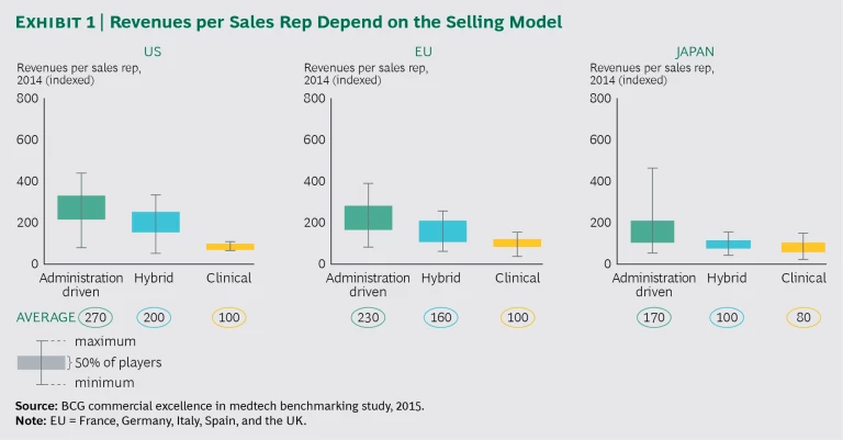 Our review of sales force models reveals that the patterns we described in 2012 are still in place. (See Exhibit 1.) Those companies that employ primarily a clinician-focused model generate revenues per sales rep that, on average, are 35% to 50% of the revenues generated by companies whose commercial models target administrative decision makers. (The revenues per sales rep of companies that use some combination of the two models are in the middle of that range.)
