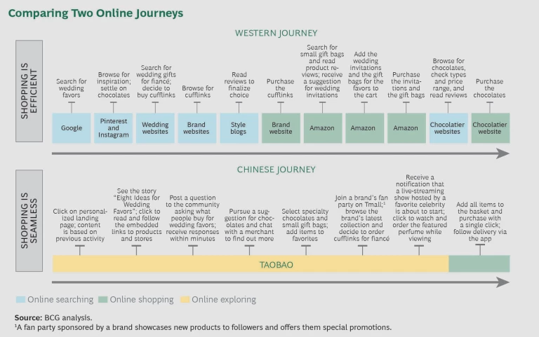 In China, the typical consumer behaves very differently. Instead of searching for specific items online in the prepurchase phase, Chinese consumers embark on a journey of exploration and discovery—as if they are going to the mall with friends or family. Chinese consumers go online to see what’s new or what’s trending, sometimes many times a day. This is partly because of the highly personalized and rapidly changing nature of the online shopping experience, which not only enables product discovery but also helps consumers make lifestyle choices.
