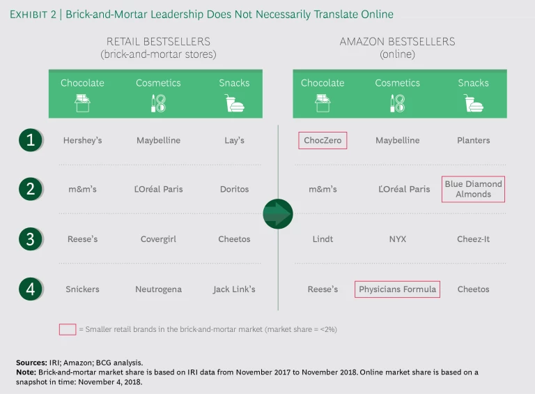 Amid those pressures, many large CPG companies continue to lag in e-commerce strategies and capabilities, falling behind in the fastest-growing channel. While most have made investments in e-commerce teams and capabilities over the past few years, those investments have not been sufficient to meet the challenge, and these large companies continue to lag smaller rivals when it comes to execution. In categories such as chocolate, cosmetics, and snacks, for example, big companies continue to enjoy relatively high market shares in the brick-and-mortar world, while a number of smaller players have carved out significant online share. (See Exhibit 2.) Hershey’s, for example, is the number-one chocolate brand in the brick-and-mortar retail world, with 12.6% market share. But on Amazon.com, the number-one chocolate brand in November of 2018 was ChocZero, which holds less than 0.5% market share in brick-and-mortar retail stores.
