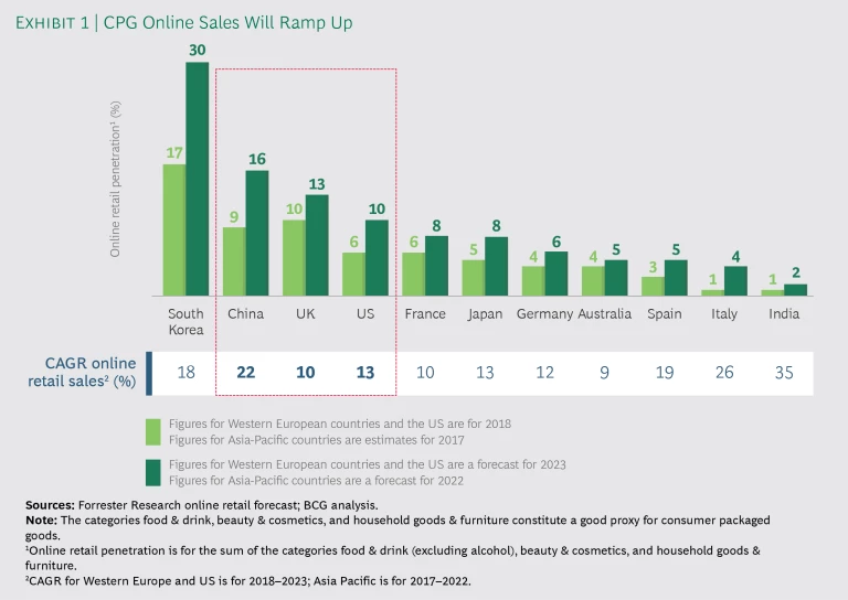 Around the world, however, the share of sales coming from online channels is expanding rapidly. Already e-commerce represents 23% of total retail sales in China, where adoption has occurred along a steeper curve. While online sales for food and drink, beauty and cosmetics, and household goods and furniture—a collection of categories that is a good proxy for CPG—are just 9% of the total in China, that figure is expected to grow to 16% by 2022. And the online share for those categories in some countries, including the US (currently at 6%) and the UK (10%), is also expected to take off over the next few years. (See Exhibit 1.)