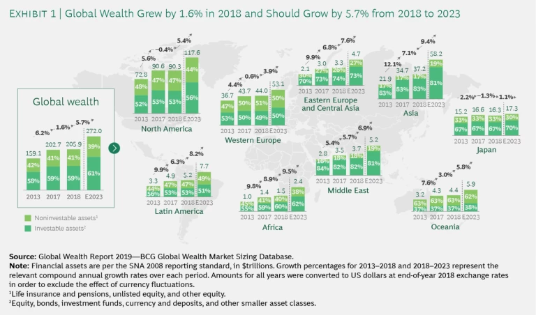 Finally, the slowing global economy—assessed in combination with projected rates of inflation, foreign currency movements, and market performance—suggests that wealth worldwide is likely to grow at a compound annual rate of 5.7% from 2018 to 2023, a slightly lower rate than in recent years.