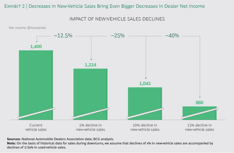 In addition, evidence points to an impending economic downturn in the United States. In a recent article, BCG projected a downturn that could see sales of new vehicles fall by 9% to 15% by 2021. A decline of this magnitude would materially reduce profits for both manufacturers and dealers—and ultimately threaten the survival of many of the latter.