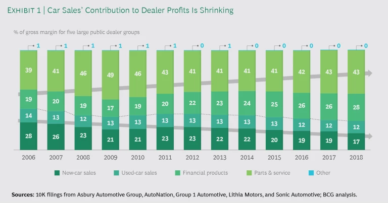 For dealers, the challenges are acute. They face ongoing declines in the sales margins of new and used vehicles, price-savvy customers who are increasingly shopping online, and growing competitive threats from players that are attacking critical elements of the value chain.
