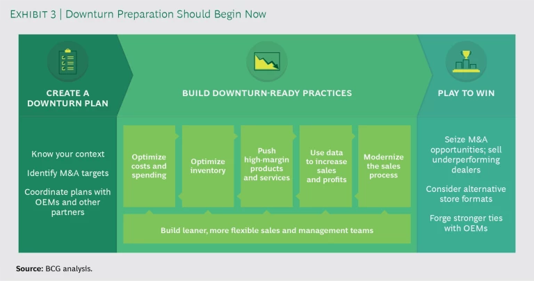 To maximize their odds of survival, individual dealers must do three things: create a plan for weathering the downturn, build downturn-ready practices, and play to win. (See Exhibit 3.)