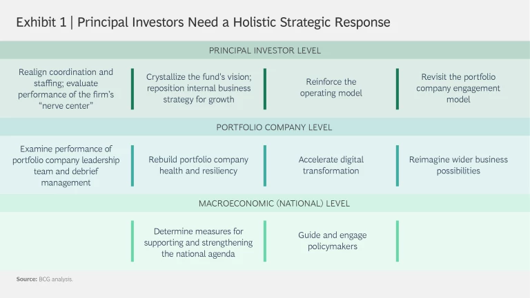 Given the wide-ranging impacts of COVID-19 on individual businesses and sectors, principal investors cannot rely on traditional strategic-planning approaches. Instead, they need to adopt a plan that considers requirements at the investor level and at the portfolio company level. (See Exhibit 1.) Sovereign wealth funds that have a larger national or economic mandate also need to clarify their role in a postpandemic society and understand how they can help government leaders and policymakers address the questions and opportunities that lie ahead.