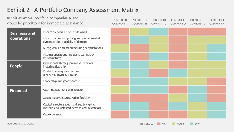 Rebuild portfolio company health and resiliency. Nearly every business has been wounded by the crisis. To triage needs (and allocate the fund’s own time and resources most effectively), principal investors should conduct a weekly risk assessment. A simple color-coded risk matrix can help identify which portfolio companies have the most acute needs and which should get help first. (See Exhibit 2.) The weekly scan will also allow investors to assess whether their remediation efforts are working and where business continuity plans need to be strengthened. To keep companies on a sound financial footing, for instance, funds should review cash management and liquidity forecasts and check whether portfolio companies are adequately stress testing their internal planning models. To improve portfolio company business operations, funds should examine supply chain and customer demand vulnerabilities and ensure that their companies’ technology infrastructure can respond to aftershocks. Finally, to improve people processes, funds should look across their portfolio companies and vet workforce policies, work-from-home infrastructure and norms, and the adequacy of people protection and engagement measures.