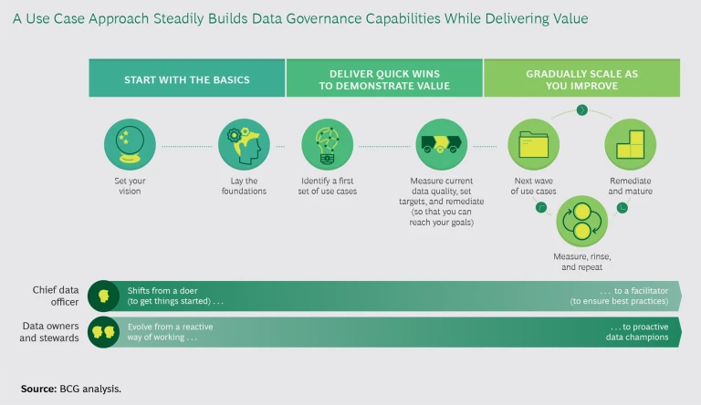 The idea is to quickly demonstrate the value of data governance and build from there. By delivering the necessary data quality for a few initial use cases, companies can achieve results fast while building the expertise, accountability, and foundations (both technical and organizational) that help them scale.