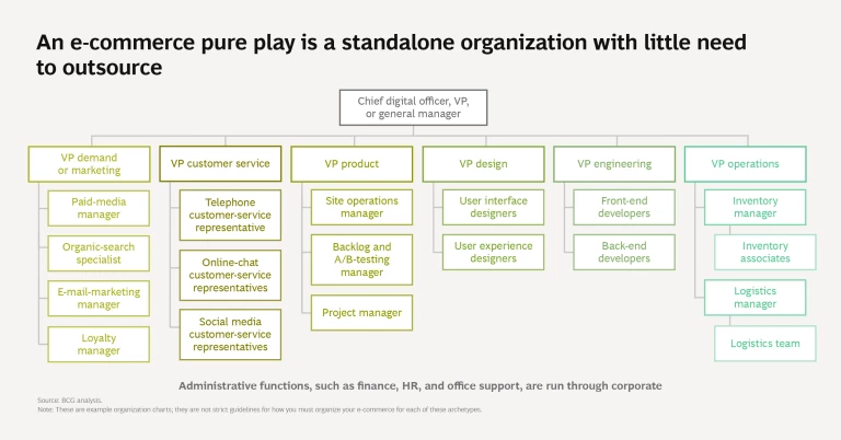 An E-Commerce Pure Play. Is the company a pure-play e-commerce business looking for growth? This will be a standalone online-sales organization with its own P&L. It will focus on developing its unique and compelling customer experience as it expands, and technical excellence and agility across functional specialties must become core aspects of the operation. As such, the enterprise is likely to build in-house capabilities, resulting in little need to outsource core functions.
