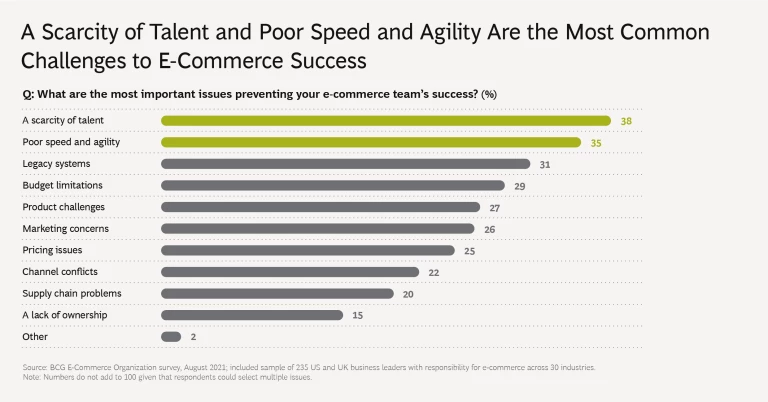 Online sales have climbed 35% during the pandemic and show no signs of slowing. As a result, 88% of e-commerce organizations in North America and the UK report that they grew in 2020 and 94% say they will expand further in 2021-2022, according to a recent BCG survey. As they do, business leaders are discovering the enormous complexity of building, maintaining, and expanding an e-commerce operation.