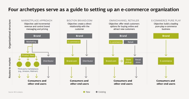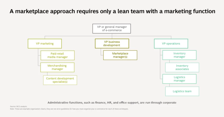 A Marketplace Approach. Is the business simply aiming to diversify its retail channels, with minimal effort? In that case, creating an organization that sells online through an existing marketplace, such as Amazon, could be the right choice. The company itself will require only a lean team within the marketing function.