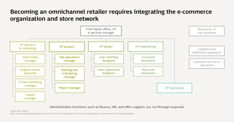 At a minimum, all companies will need to build or manage a basic e-commerce platform and an analytics system to measure progress, while putting a strong leader in charge of each key function. Successful organizations tend to invest heavily in centralized data analytics, which serve as the primary source of truth and direct customer contact. In addition, these businesses make sure to gain buy-in from senior executives about the enterprise’s strategic purpose within the broader company; it’s best to know where e-commerce intersects with the rest of the operation and ensure that it has good support from leadership.