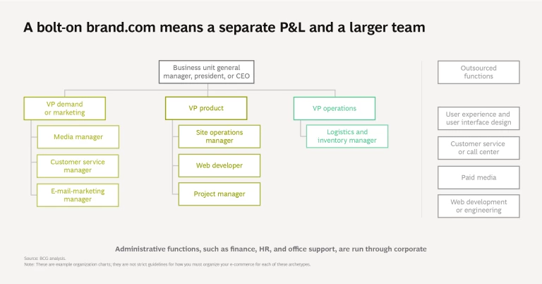 A Bolt-On “Brand.com.” Is the organization looking to build its own DTC relationship? In that case, it may choose to set up a separate P&L for the e-commerce business and hire a larger team—but still outsource some functions. This team would commonly report to the company’s chief digital officer.