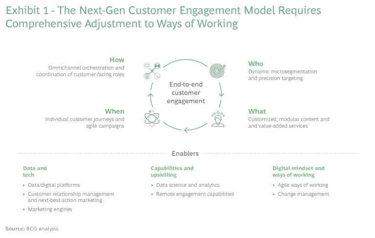 The next-generation customer engagement model employs specific technological and human enablers. The tech tools are important, of course, but the right capabilities, skills, and ways of working may be even more so.