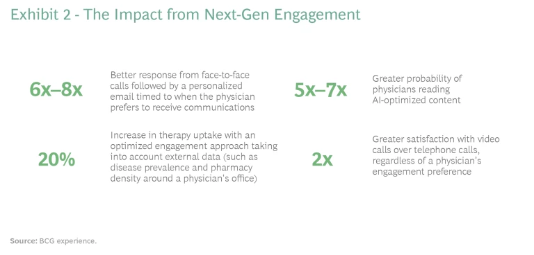 The changes taking place in the health care sector represent a rare opportunity for pharma companies to radically rethink how they engage with customers. In our experience, companies that embrace the next-gen engagement model and put in place the required technology and human enablers have seen improvement in two areas. The first is physicians’ conviction that the information they receive helps them provide the best possible treatment to patients. The other is significant commercial acceleration. We are already seeing how enhanced engagement brings benefits for customers, patients, and pharma brands. Early movers will establish lasting sources of advantage over latecomers.