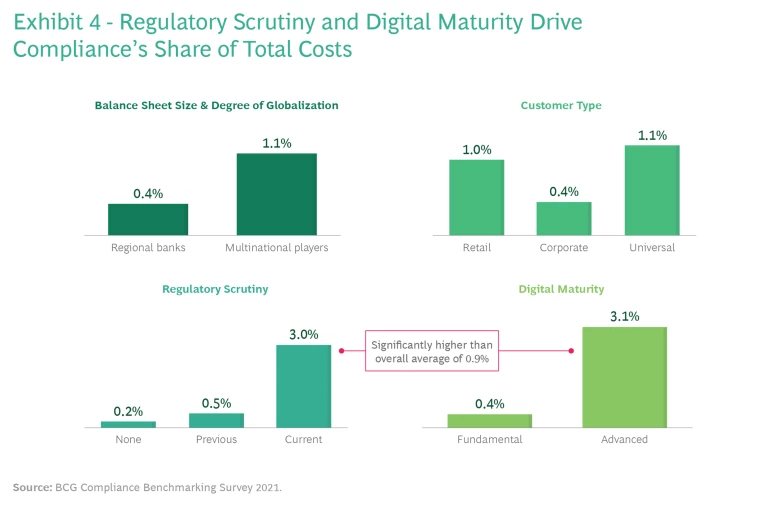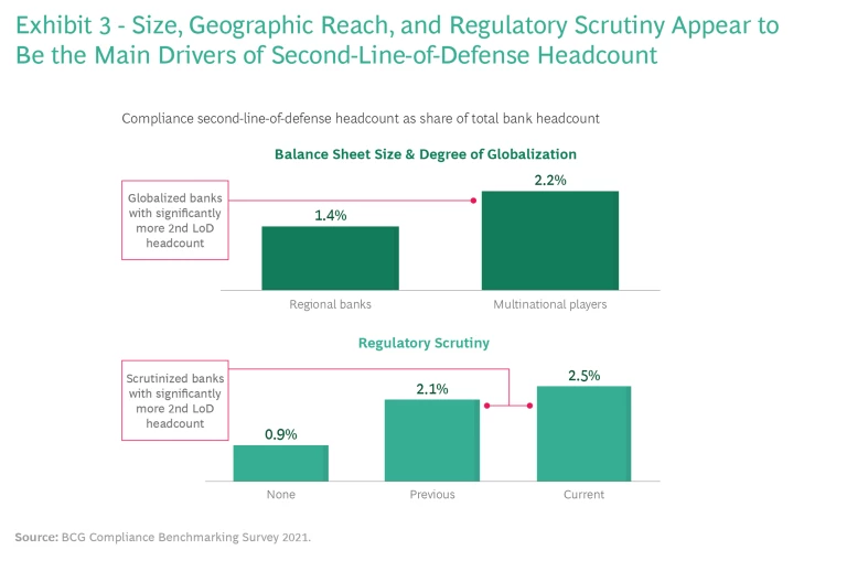 - The level of regulatory scrutiny has a clear, long-lasting effect on the size of compliance functions beyond the ad hoc need for additional capacity that is common during the remediation of regulatory findings or monitorships.