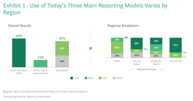 With the evolution of compliance, three main organizational models have emerged. (See Exhibit 1.) The first places compliance within the risk department (the CCO reports directly to the chief risk officer); the second involves board representation for compliance; and in the third, compliance departments report directly to the CEO or another board member. We found striking regional variations in how these models are adopted.