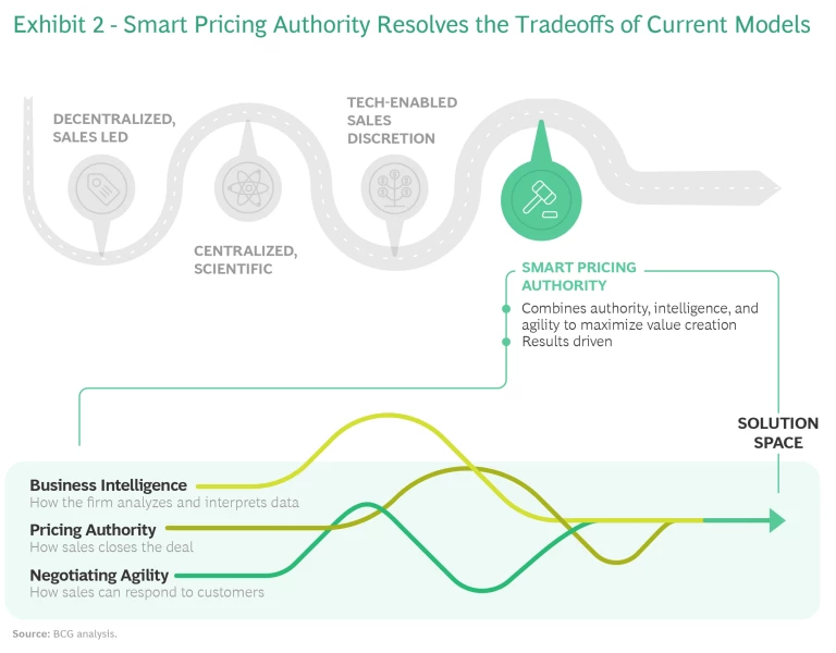 Smart pricing authority is not a natural outcome of the technological and pricing science advancements that make it possible. Rather, it is a conscious strategic decision on how to combine business intelligence, pricing authority, and negotiating agility in ways that make them mutually reinforcing. (See Exhibit 2.)