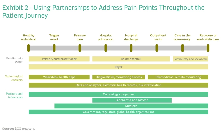 Since no company has the offerings, capabilities, or access to patients or providers to cover the entire journey at scale, it’s critical to partner with players who own parts of the journey that others cannot easily address themselves. (See Exhibit 2.)