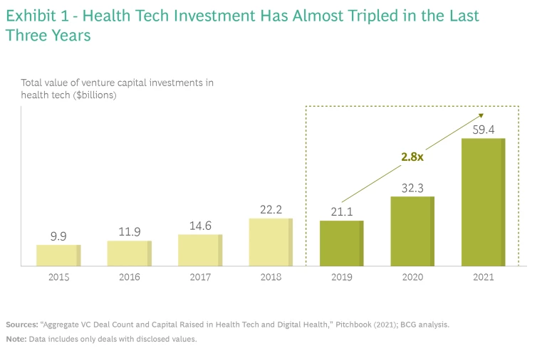 The past few years have brought significant growth in health tech across digital health solutions, platforms, software, hardware, data, and artificial intelligence to solve medical problems and improve patients’ lives. This surge of advancement is only just ramping up, as evidenced by recent growth in venture capital investment. (See Exhibit 1.)