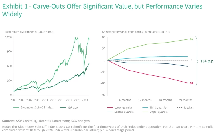 Across industries, carve-outs are on the rise. From July 2020 through June 2021, the quarterly average deal value was $309 billion, 25% higher than the five-year average ($247 billion per quarter). There is a clear logic behind this trend: carve-outs create value. From 2003 through mid-2021, returns for the Bloomberg Spin-Off Index more than doubled those of the S&P 500. Yet performance varies widely between the winners and losers. Only about 50% of deals create value in the medium term, and poor performers can lose significant value, producing total shareholder return that’s more than 100 percentage points below the leaders. (See Exhibit 1.)