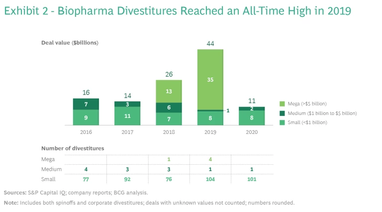 The carve-out trend in biopharma is just as strong as it is in other industries. Activity in 2020 was artificially low because of the pandemic, but 2019 was an all-time high, with $44 billion in deal value, including four carve-outs of more than $5 billion. (See Exhibit 2.) All signs suggest that divestitures will resume as the business environment slowly returns to normal. Strong valuations, the continued impacts from loss of exclusivity, and pricing pressures are together spurring an increase in carve-outs, as biopharma companies reshape their portfolios to better meet the needs of the market and create value for shareholders.