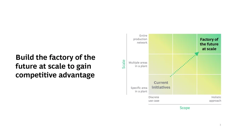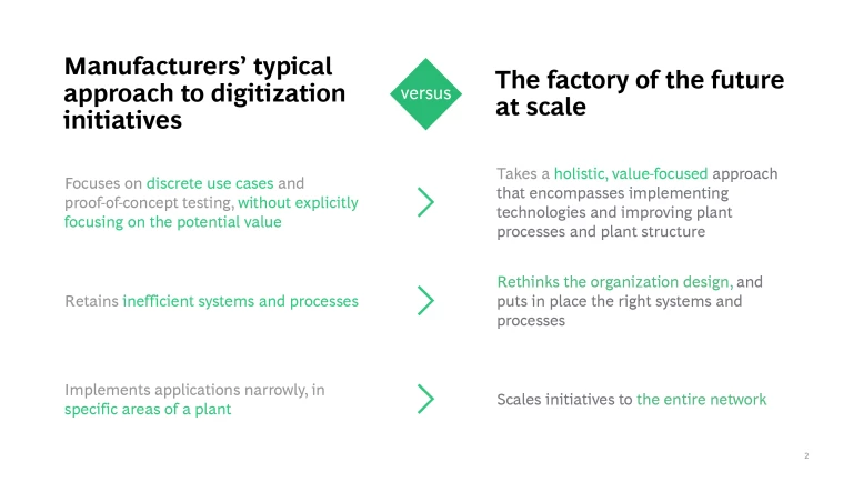 Building the Factory of the Future at Scale. In their efforts to digitize operations, many manufacturers have focused on narrow implementations of discrete use cases. To capture the full value of these digitization efforts, companies must take a holistic approach that encompasses not only implementing technologies but also improving plant processes and structure. And they must discontinue efforts that do not deliver the expected results and scale up those that do throughout the entire production network, not only in specific facilities. In other words, companies must build the factory of the future at scale.