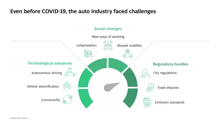 The coronavirus crisis arrived at a time when automotive OEMs were already facing the greatest disruption that their industry has ever seen. Several auto-industry trends—including autonomous driving, vehicle electrification, connectivity, and shared mobility—have converged to upend decades-old business models. The pandemic-induced recession has added to these challenges, with car sales decreasing significantly across the globe. In the US, for example, sales declined by 31% from December 2019 through May 2020. As a result, OEMs face even greater pressure to adjust their business models and make overdue structural changes.