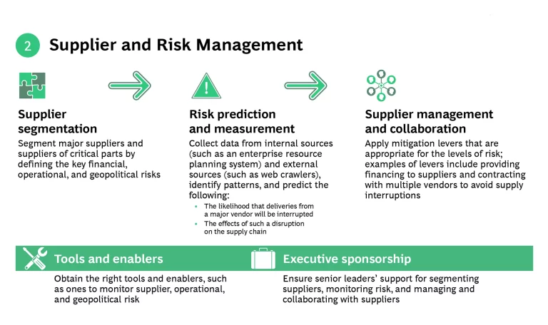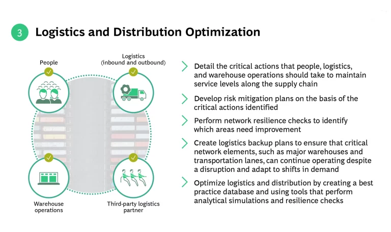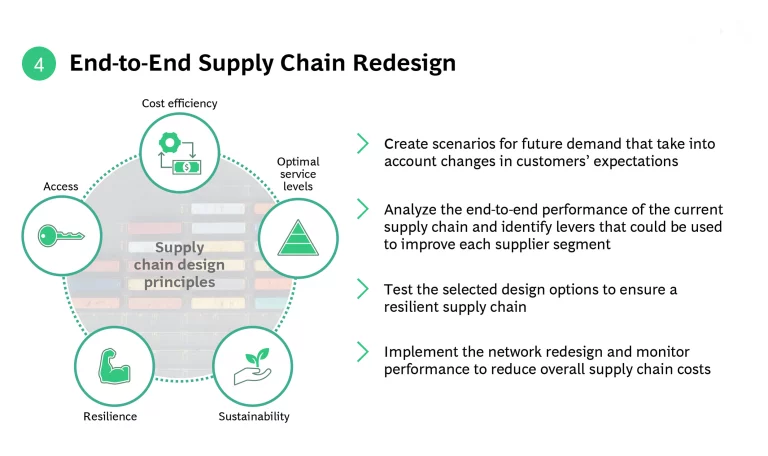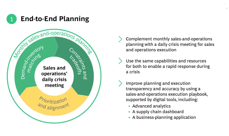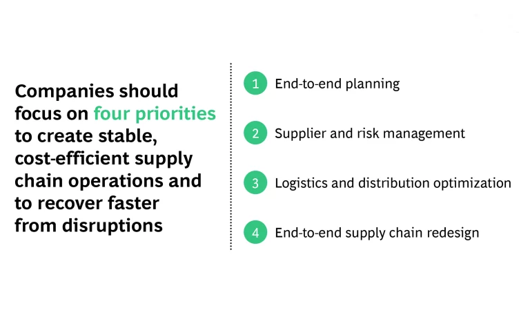 To accomplish their goals, companies should focus on four priorities: end-to-end planning, supplier and risk management, logistics and distribution optimization, and an end-to-end supply chain redesign. We delve into each of these topics in the slide show below.
