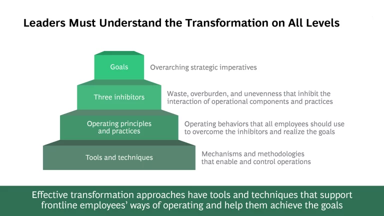 1. Understand what a transformation means on all levels. Leaders must understand the higher-level goals of the transformation and the main inhibitors to achieving them. (See the exhibit.) Moreover, they should be capable of articulating—in layman’s terms—these goals and problems accurately and consistently. It is not enough to expound the virtues of the many hundreds of improvement tools. A comprehensive understanding of the transformation is essential for bringing the entire organization along on the journey.