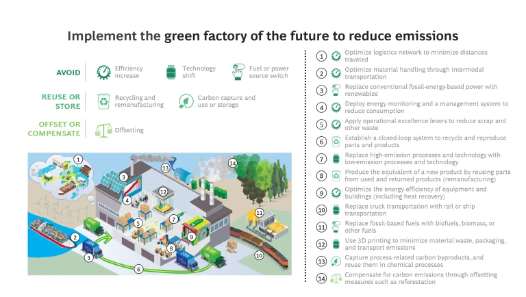 As a result, a company needs to strongly focus on continuously reducing its carbon footprint, especially with respect to its production processes. By implementing a concept that we call the green factory of the future, a company can apply levers to avoid, reuse or store, and offset carbon emissions along the entire value chain.