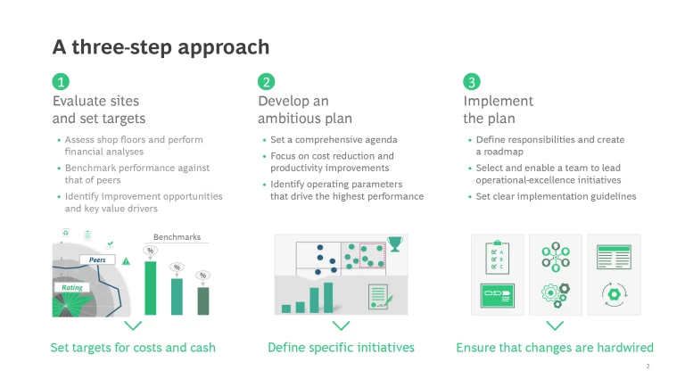 - Evaluate sites and set targets. Conduct thorough shop-floor assessments and perform financial analyses. Benchmark plant outcomes against those of peers. The evaluation will reveal improvement opportunities and key value drivers. Use the insights to set ambitious but realistic targets for costs and cash.