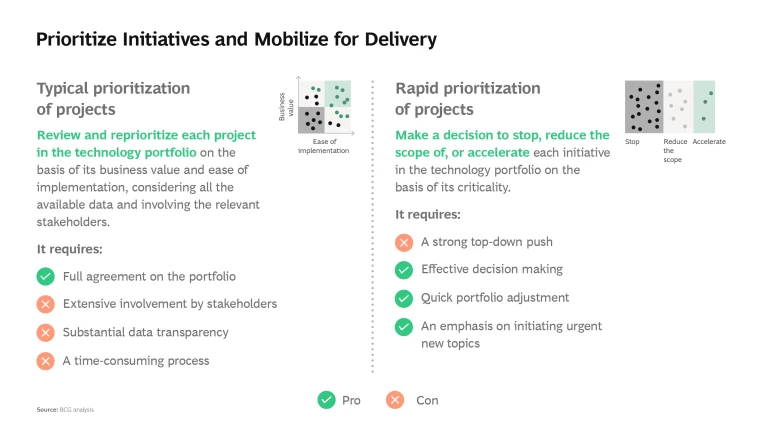 Prioritize initiatives and mobilize for delivery. As the company prioritizes the identified measures and creates an actionable roadmap, it will need to make tradeoffs given the limited resources that are available for running current and new initiatives. A company should therefore accelerate only four types of critical projects: