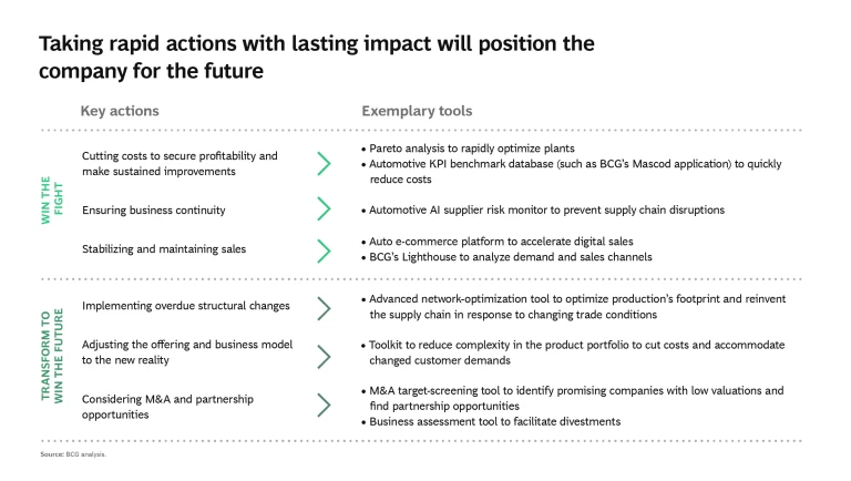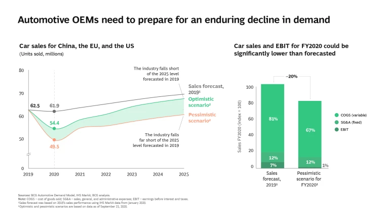 - Implementing Overdue Structural Changes. As OEMs grew in recent years, most accumulated structural problems in their operations, such as overcapacity and inefficient manufacturing footprints and dealer networks. The current crisis creates momentum for change that allows companies to address these problems and realign company structures to changing environments, both during and after the crisis.