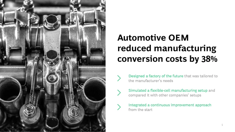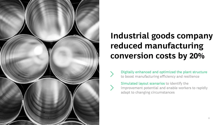 5. Provide the supporting organization structure and capabilities. A company must develop the right organization structure and embed the capabilities needed to deliver the transformation. Operations leaders and plant managers who run a steady-state environment may not have the right capabilities to drive a transformation, such as the ability to prioritize initiatives and focus their teams on the right tasks. Importantly, these leaders also need the will and energy to disrupt the status quo and lead the change.