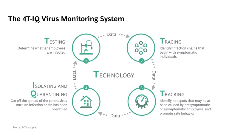 To safely resume operations during the ongoing COVID-19 pandemic, companies must take steps to monitor and prevent the spread of the coronavirus among their workers. An effective approach is what BCG calls the 4T-IQ virus monitoring system (VMS)—one that companies can adapt to their workplace and sustain.