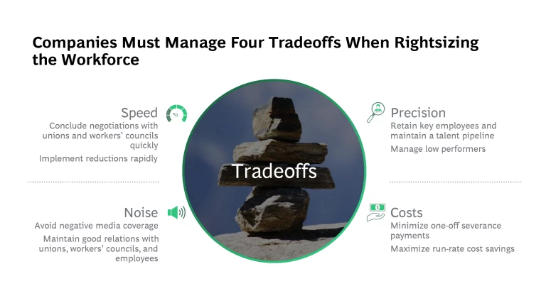 In deciding how to rightsize the workforce, companies need to manage tradeoffs in four dimensions. (See the exhibit.) Because it is not feasible for companies to achieve the best outcomes in all four dimensions, they need to thoroughly discuss the tradeoffs and prioritize the actions that will most effectively promote their company strategy.