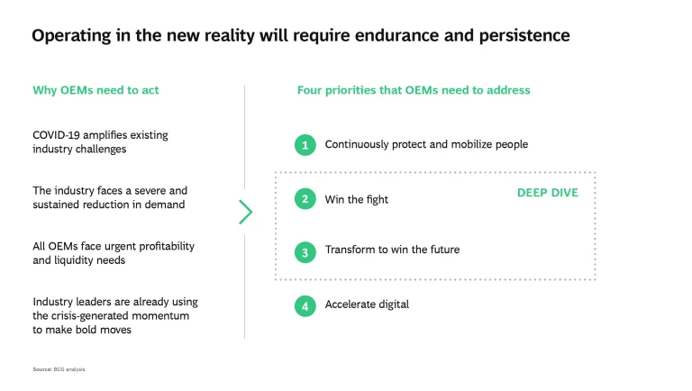While maintaining a safe and healthy work environment, executives at OEMs must simultaneously manage two efforts on different time horizons. They must take immediate actions to win the fight as the pandemic persists (most likely for 12 to 24 months until an effective vaccine or treatment is developed and widely deployed). And they must initiate bold transformative actions to win the future.