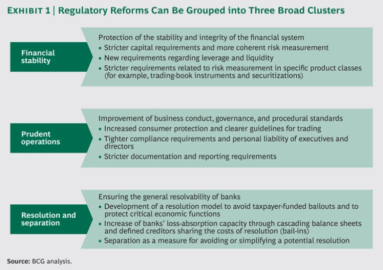 To assess the current status and future effects of regulatory reform, we have classified the entire spectrum of regulatory reforms, grouping them into three clusters: financial stability, prudent operations, and resolution and separation. (See Exhibit 1.)